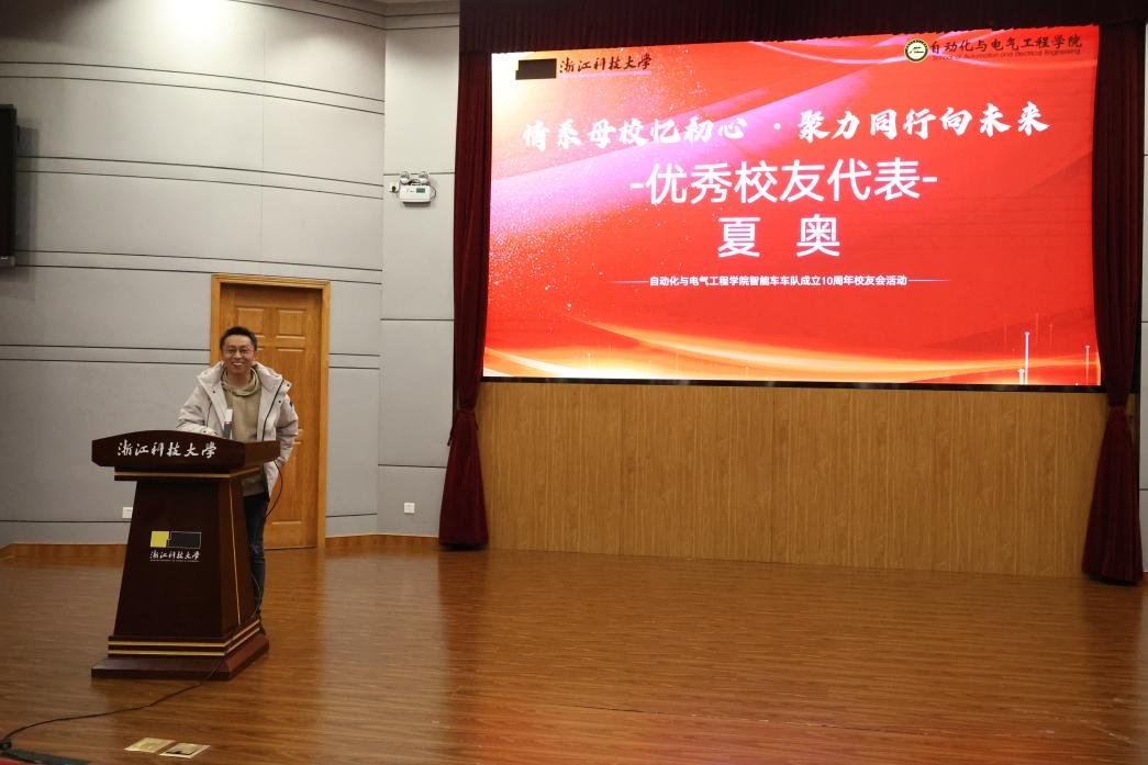在校生代表缪冠毅同学上台,分享了自己在智能车实验室的成长经历与感悟,展现了新时代浙科学子接续奋斗、追求卓越的精神风貌。