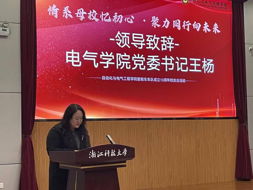 学院党委书记王杨对返校校友表示热烈欢迎,向长期以来关心支持学院发展的校友们致以诚挚感谢。她指出,学院始终秉持“以赛促学、以赛促练、以赛促创”的理念,引导学子将课本上的公式转化为实实在在的技术,让青春的汗水凝结成闪亮的奖杯。而智能车队“不服输、敢创新”的精神,生动诠释了浙江科技大学“崇德尚用,求真创新”的校训,为母校和学院赢得了良好的社会声誉。同时对在场校友与学子提出三点期望:希望大家带着车队的“精气神”,胸怀家国勇担当;希望大家保持对技术的“执念”,勤于学习敢创新;希望大家把“家”的情谊传下去,携手共进同成长。殷切的嘱托与美好的期许,为在场师生与校友注入了前行的力量。
